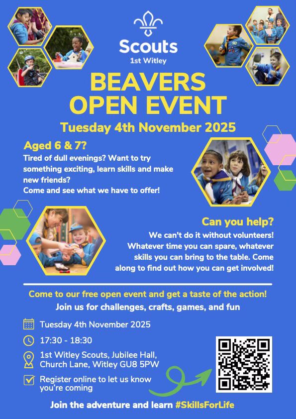 1st Witley Scout Group are relaunching Beavers in November and would like to invite parents and their 6 to 7 year olds to join us for an Open Event on Tuesday November 4th where we’d love for you to come to the Jubillee Hall to experience some of the activities we run and see what Beavers is all about. If you come along you’ll be able to sign up for 3 free taster sessions on consecutive Tuesdays with a view to sign up new Beavers for the start the new Beaver term in January. So please confirm you’d like to come to the Open Event by clicking this link below.