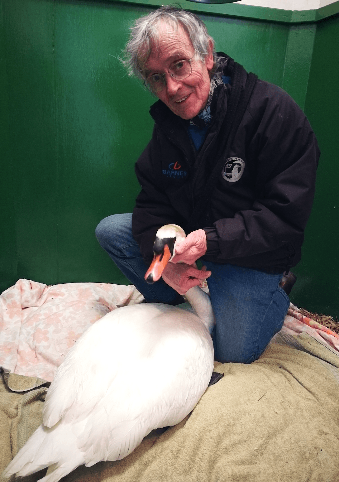 “We had a phone call about a Swan on the A3, when Paul and I arrived the Police had coned off one lane which made the rescue a lot safer, so Paul and I climb down into the ditch and I managed to untangle him the bramble he had fallen into (the Swan that is not Paul), we then got him into the Swan bag, Paul scrambled to the top of the ditch and carried the Swan to the car, meanwhile I’m still in the ditch, the kind policeman held his hand down to me and managed to (drag) help me to the top, I said “thanks I can’t believe I’m doing this at 75” and he said “You’re our hero mate” that’s a first! a police officer calling me a hero.