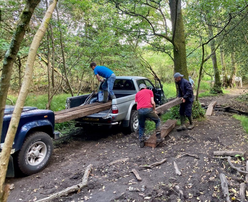 Encouraged by the result from reshaping the ditches the group became very enthusiastic and things really took off. More sleepers were bought, 16 tonnes of material were donated by Axtell, The Merry Harriers gave approval to the use of their car park for storage of this; a special narrow tracked dumper was hired at a reduced rate from Shorts at Milford Station together with a plate compactor. A route across Buss’s Common for a few vehicles was negotiated with Stephen Dean who very kindly gave his permission. This access allowed the group to transport some sleepers to the very boggy area at the junction of the bridleway with Buss’s Common. These were needed to build a two span narrow footway bridge across this area which is adjacent to what was an ancient fish pond. The silted up ditch was re-established and partly re-aligned by hand digging to divert the flow under the bridge. A crossing over the ditch for horses was also built. The filling material has been used along the wetter sections of the route and some of these now have raised sleeper walkways to allow walkers to keep out of the mud. Further work continues!