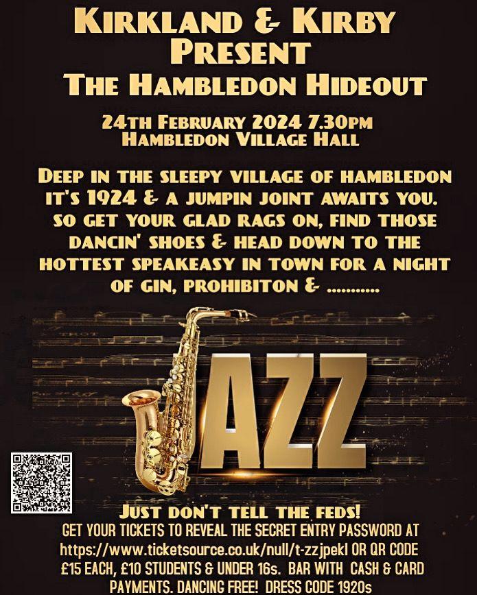 Full bar available before, during and after the performance and do stay on after the show for dancing! Please scan the QR code for tickets or follow the link. https://www.ticketsource.co.uk/the-hambledon-hideout. 1920’s dress code optional.
