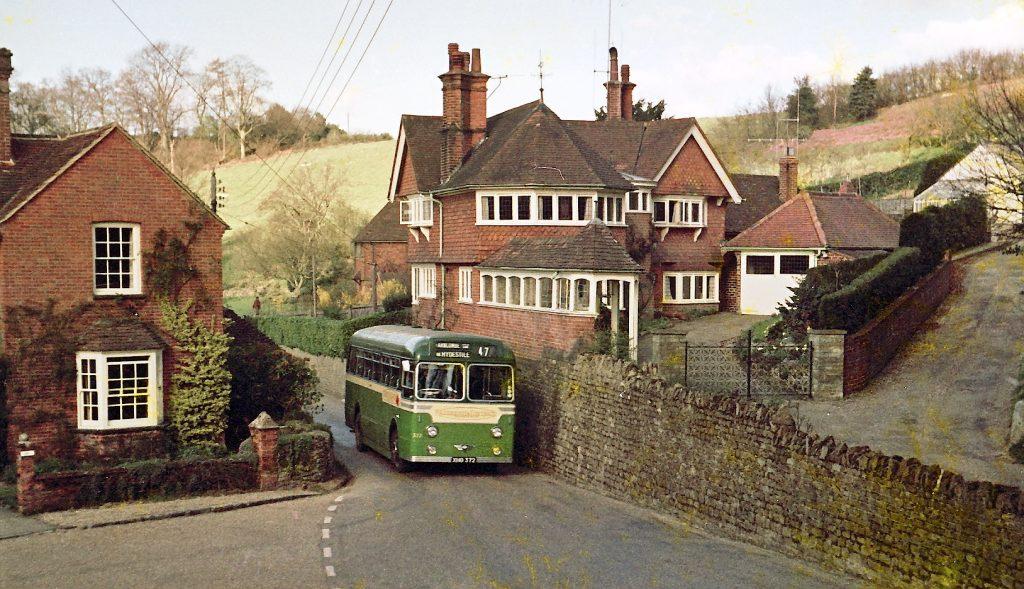 Below is an earlier view of the 503 in the village centre and a photo from 1966, taken at the same location when the service was the 47, operated by the Aldershot and District Traction Company.