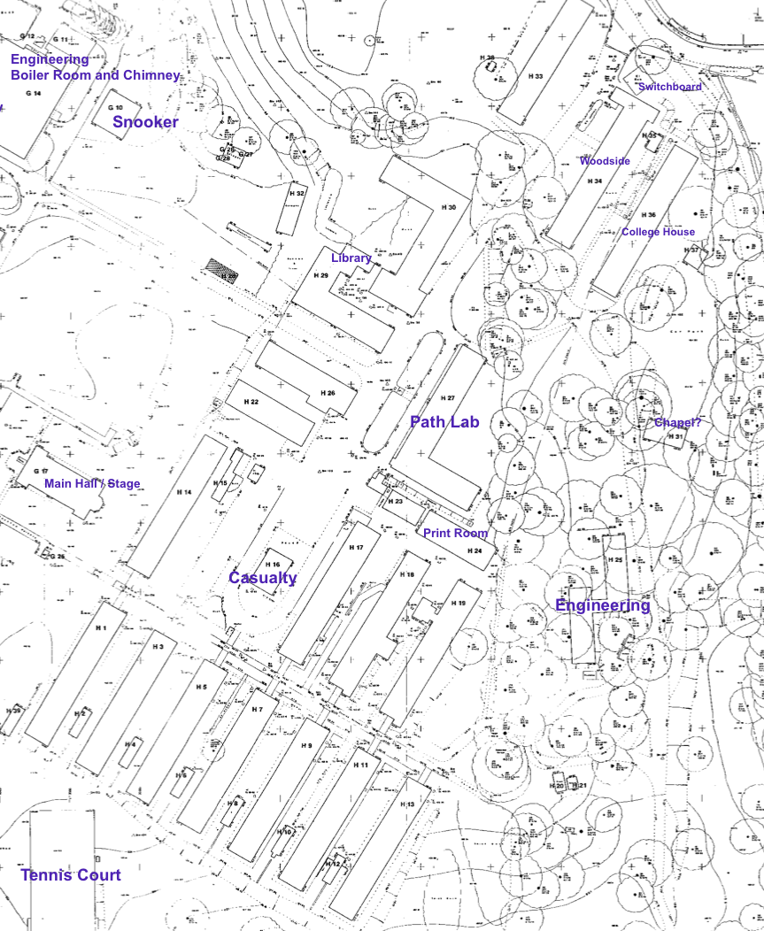 The site was strictly separated from the adjacent KGV by a chainlink fence. The huts lasted well beyond their intended lifespan and many were used for a variety of roles including operating theatre, chapel, children’s ward, engineering workshops etc. The brick buildings included pharmacy, path lab and staff canteen. The Nissen hut casualty department was demolished in the 1970’s.